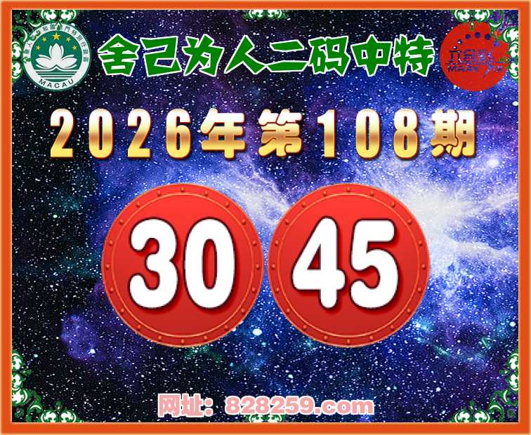 108期:【舍己为人】二码中特⚽【30.45】开:45